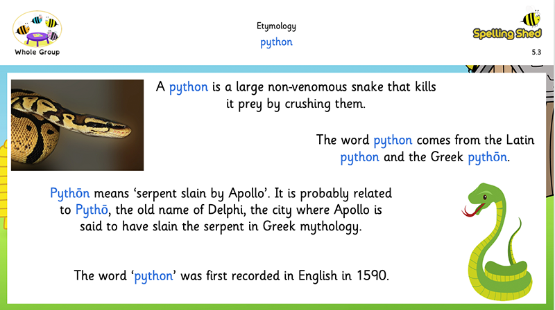 Each lesson is fully resourced and includes a clear lesson plan, a lesson presentation and worksheets. Spelling Shed is designed to be flexible and will seamlessly fit into the varying timetables that schools have. Each lesson has a number of modular components, which can be taught as a single lesson or split into a number of sessions.
